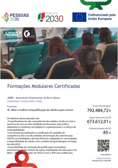 FORMAÇÃO MODULAR CERTIFICADA da AEBB, é cofinanciado pela União Europeia e pelo Programa Temático Demografia, Qualificações e Inclusão (Pessoas2030) do Portugal 2030.